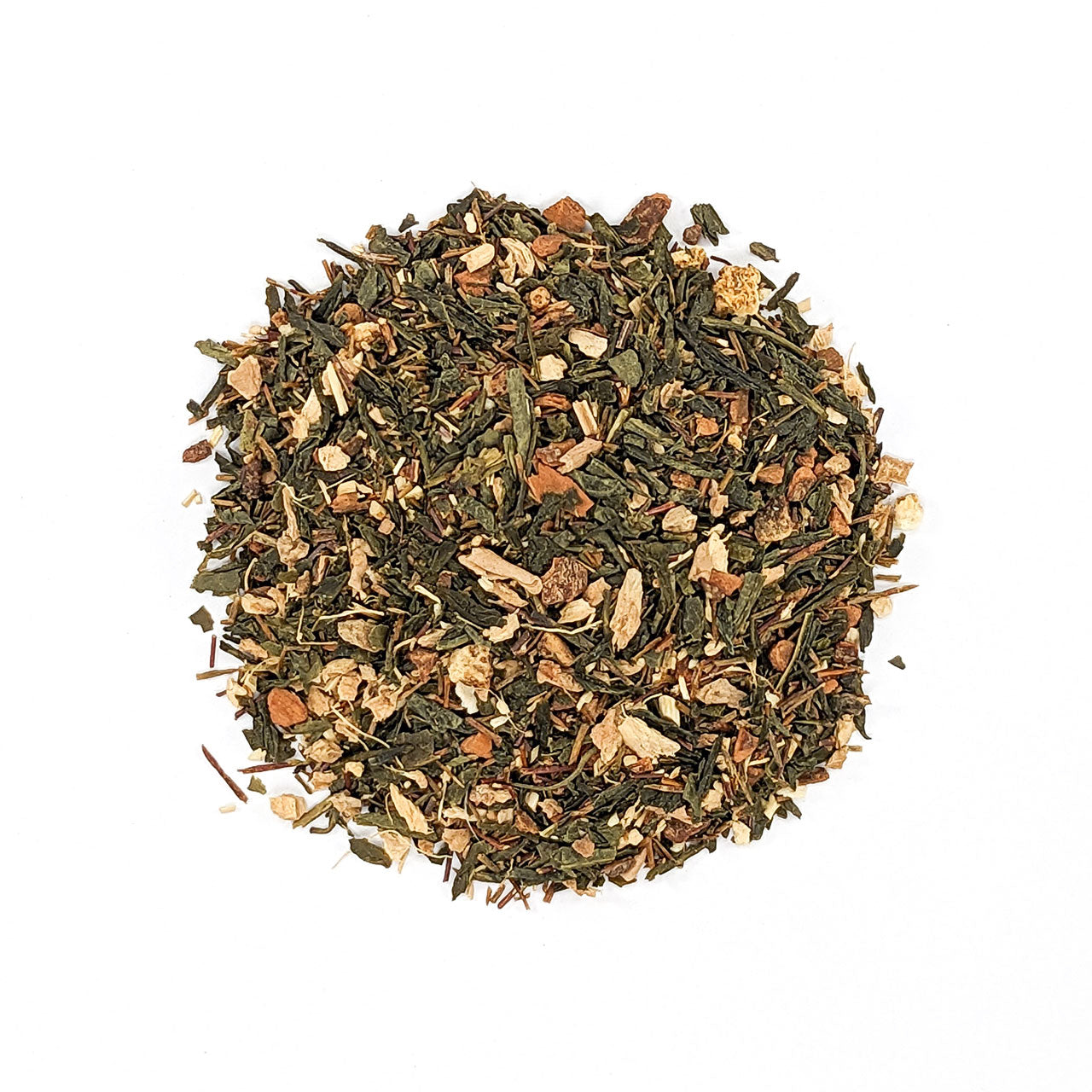 Warming green tea blend. Earthy Sencha and herbaceous green rooibos with a bit of spice of ginger and a fruity touch of mango. Contains caffeine. Two Ounces.
